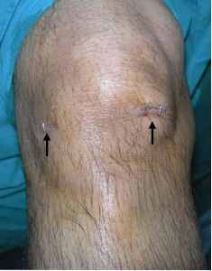 Arthroscopy comes from a Greek word Artho & Scopien which literally mean to look into the joint. Arthroscopy is a procedure by which various joints in the body (Knee, Shoulder, Ankle, Hip & Wrist) can be inspected and treatment given by a small pencil shaped instrument called arthroscope (Telescope). This is a keyhole incision surgery where two single stitch incisions (Pic.1). are usually enough to treat any problem which would have normally required a large incision ( Pic.2). This has been made possible by technological advancement in Bio-engineering field. The small instruments (biters, shaver, probes, scissors etc.) also measuring 2 to 5 millimetres, are placed into the joint through separate incisions to remove torn cartilage, trim torn structures, or do other procedures.